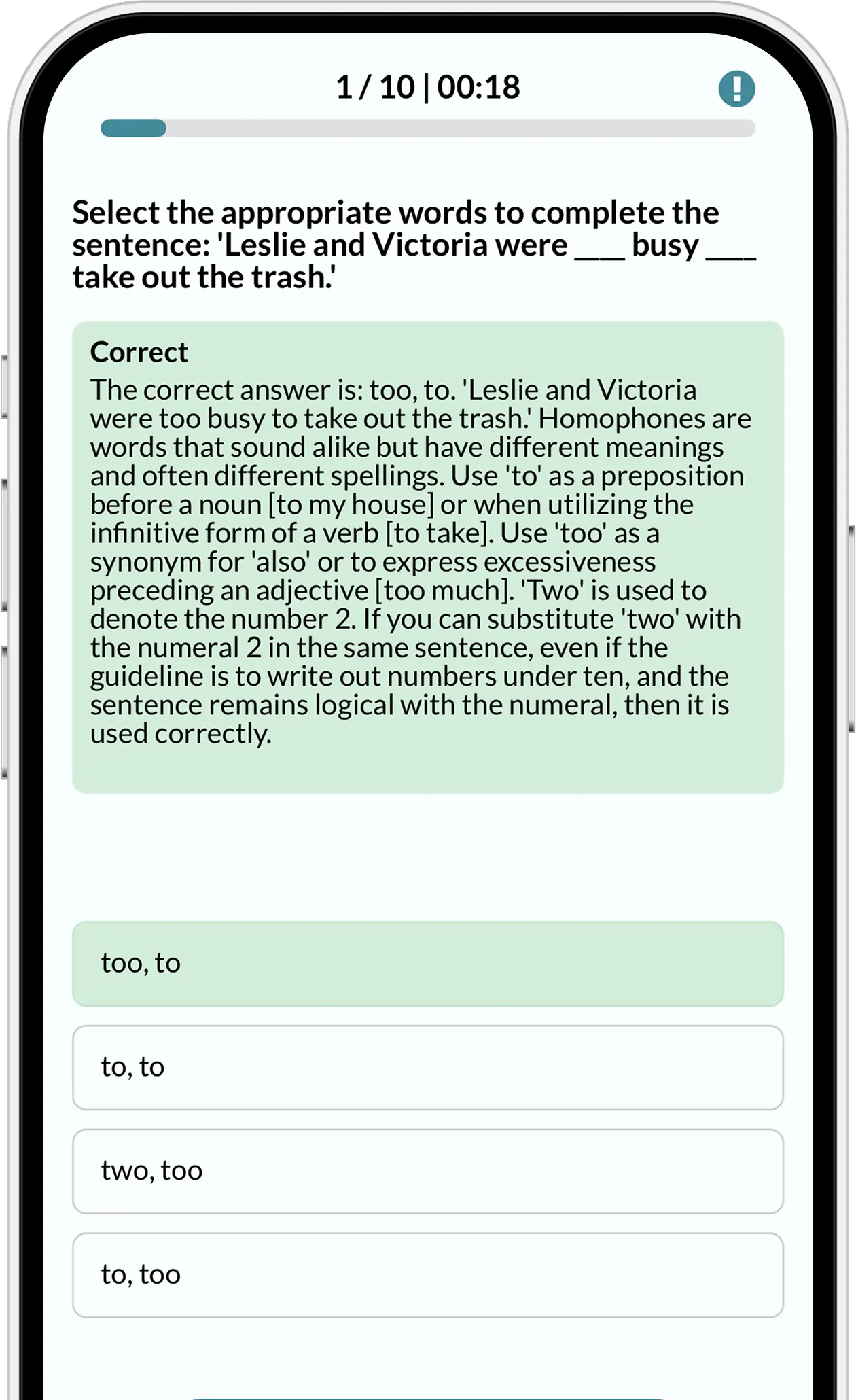 Every practice question comes with a clear, step-by-step explanation so you understand your mistakes immediately. Master even the toughest concepts—whether you’re revisiting old material or tackling new challenges.